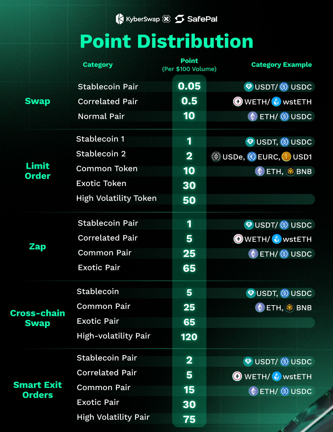 - Points are earned through trading activity on kyberswap.com using: Swap, Zap, Cross-Chain Swap, Limit Order, Smart Exit Orders